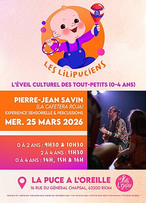 Pour cette troisième session, Pierre Jean-Savin embarquera à nouveau les Lilipuciens à voyager dans son univers à travers des expériences sensorielles, des mélodies et chants intuitifs. Le concert sera ponctué d’échanges, de pratiques sonores, de manipulations d’instruments pour partager un moment de découverte en famille.