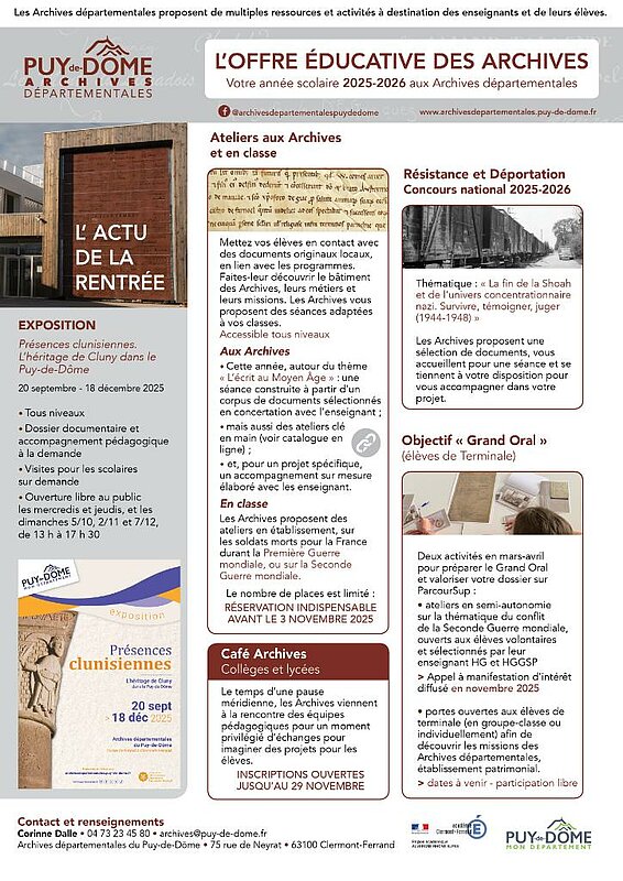 Archives départementales du Puy-de-DômeOutre les outils en ligne, les Archives départementales organisent des ateliers avec les classes qui sont autant d’occasions pour les élèves de se familiariser avec la recherche historique, les archives et le métier d’archiviste, mais aussi d’éveiller leur sensibilité à l’importance de la conservation du patrimoine. Elles accompagnent également établissements scolaires et enseignants volontaires des premier et second degrés pour participer à la construction de leurs projets EAC ou à leur participation au Concours national de la Résistance et de la déportation.
