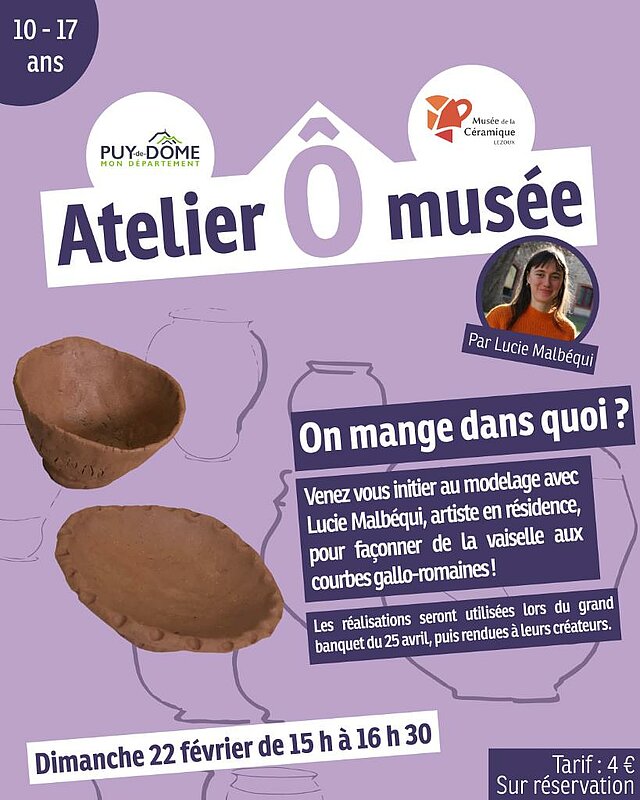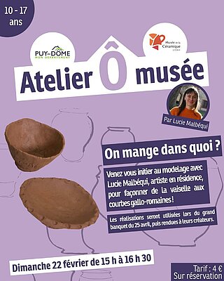 Le dimanche 22 février, les adolescents pourront s'initier aux gestes du modelage avec l’artiste Lucie Malbéqui et façonneront des assiettes et des bols aux courbes gallo-romaines. Tous ces objets réalisés prendront vie lors d’un grand banquet préparé collectivement le 25 avril, puis rendus à leurs créateurs.