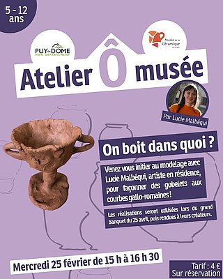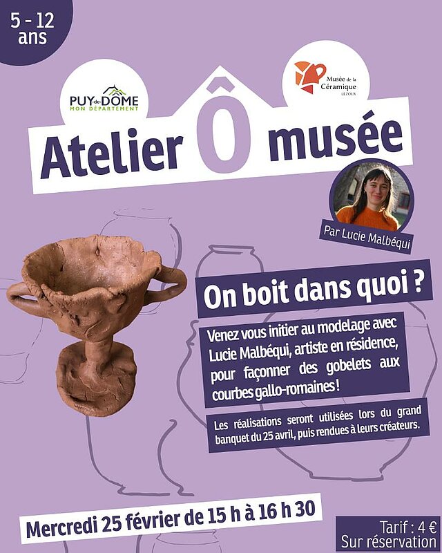 Le mercredi 25 février, les enfants pourront s’initier aux gestes du modelage avec l’artiste Lucie Malbéqui et façonneront des gobelets aux courbes gallo-romaines. Tous ces objets réalisés prendront vie lors d’un grand banquet préparé collectivement le 25 avril, puis rendus à leurs créateurs.