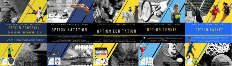 5 sections sportives : équitation, tennis, natation, football et basket.